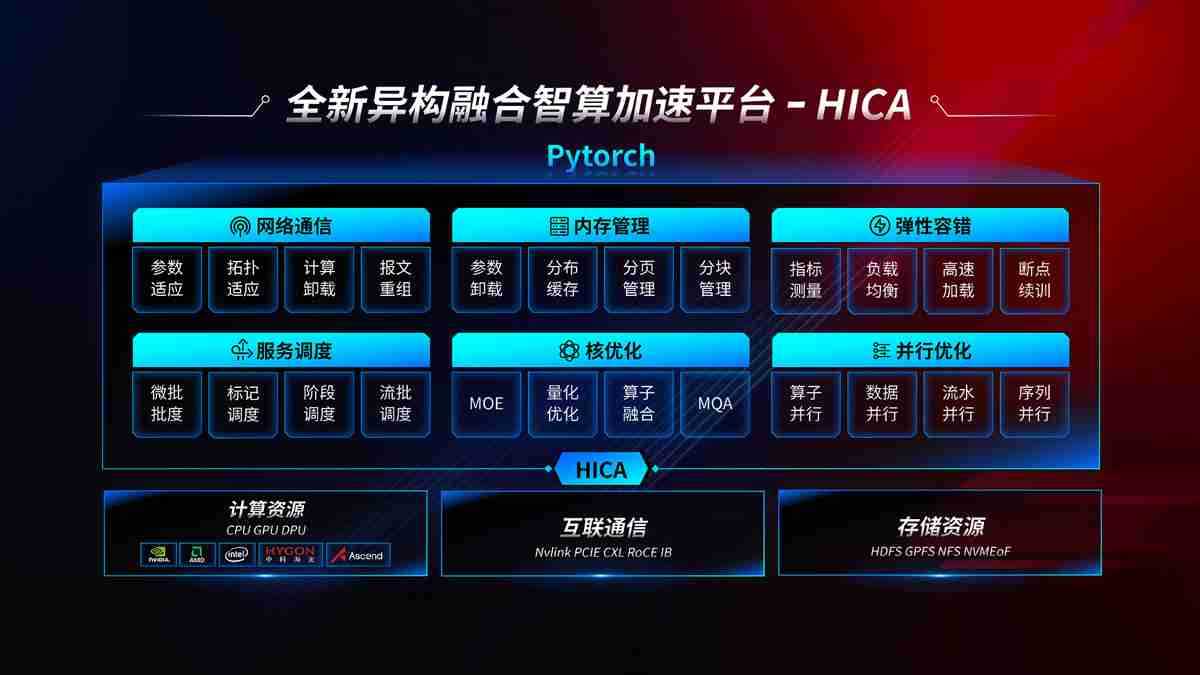 通过自研的服务层、、、、中间适配层、、、、以及调度编排算法,,,采用数据并行、、模型并行等多种并行方式,,,,把并行计算任务进行有效的分解,,使其分别由相应的软件栈和算力资源来承接。。。。当GPU资源变化,,HICA可以实时动态调度计算子任务并调整模型拓扑和架构,,,以充分聚合各种算力资源。。。。