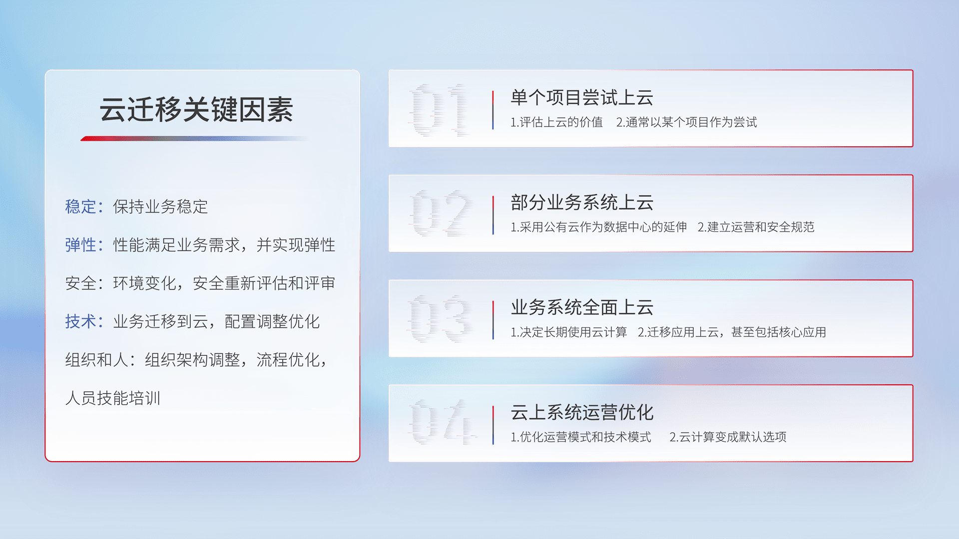 结合实际业务,,从规划设计、、云平台选型、、、、云原生改造、、数据迁移、、集成交付,,迁移全过程为客户识别最佳上云路径,,,做好风险识别管理,,设计网络架构、、、身份权限、、、安全审计合规、、、操作审计、、、日志审计、、监控告警策略、、、多站点容灾设计等,,,对云上基础设施进行整体规划,,,提升IT治理水平,,,,以满足弹性、、、、高可用、、高性能的需求。。。。